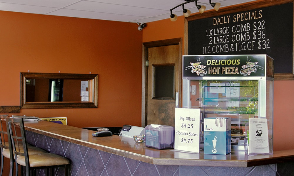 Located on Main Street, Sam's Trenton combines the unique flavour of Pictou Countys famous pizza sauce together with the freshest ingredients to produce pizza that will delight your family and friends. We offer a variety of Pizzas, Donairs, Pasta, Burgers & more!